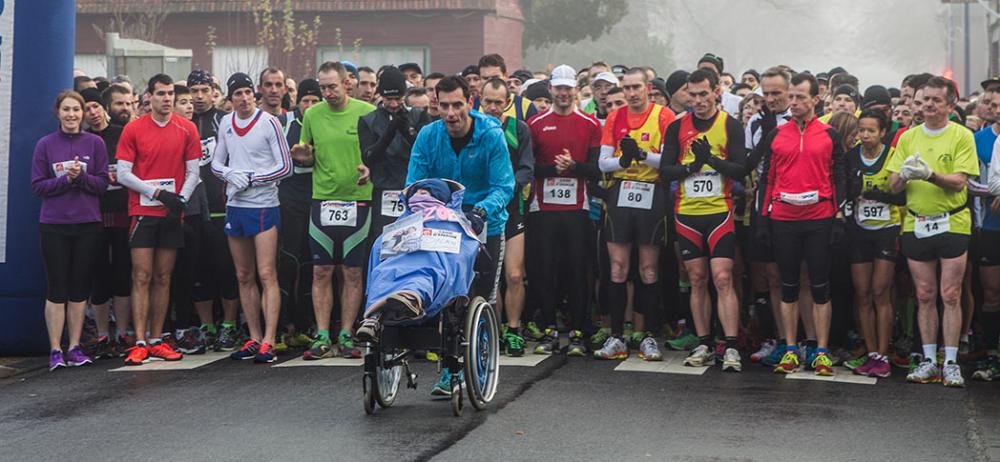 Ces personnes souffrants d un handicap effectuant la course dans des fauteuils et joelettes poussés par des papas et formidables accompagnateurs, malgré le froid toujours avec le sourire .